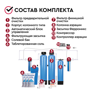 - защитить от растворенного железа, с помощью системы аэрации, входящей в состав комплекта окисляет его и фильтрует на колонне обезжелезивания;