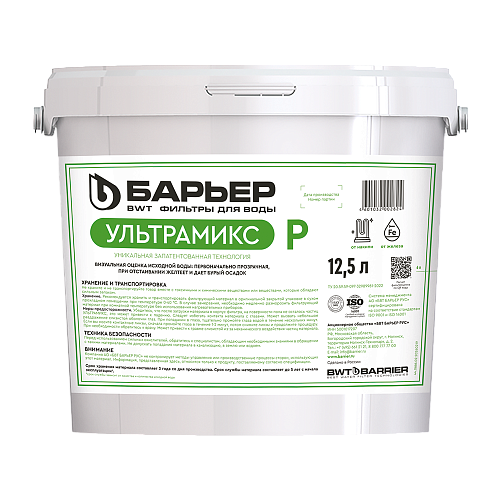 Фильтрующая загрузка БАРЬЕР УЛЬТРАМИКС®С предназначена для системы очистки воды из скважины со значительными сезонными изменениями по содержанию органических соединений в течение года. Очищенная вода подходит для хозяйственно-бытовых нужд и промышленного применения. Для питьевой воды рекомендуем в качестве финальной ступени дополнительно установить систему обратного осмоса. Вид упаковки фильтрующей засыпки – пластиковое ведро 12,5 л.
