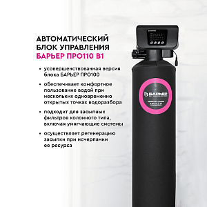 Автоматический блок управления БАРЬЕР ПРО110 В1 модернизированная версия блоков с повышенной производительность на меньшем перепаде давления, чем серия ПРО100 РВ. Они обеспечивают более комфортное использование воды при нескольких одновременно открытых точках водоразбора. Благодаря увеличению скорости потока солевого раствора, регенерация умягчающей фильтрующей загрузки происходит эффективнее, что продлевает ее срок службы и обеспечивает высокое качество очистки воды.