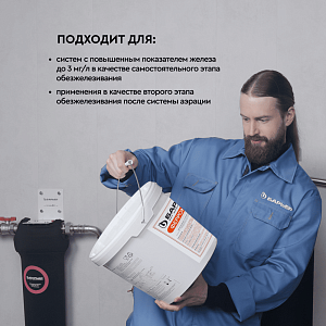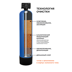 Работает при исходных показателях железа в воде до 50 мг/л в составе комплексного решения с системой аэрации БАРЬЕР.