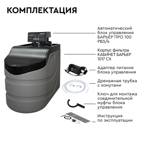 КАБИНЕТ БАРЬЕР 1017 СX это удобная и понятная в использовании система, которая регулирует процессы фильтрации и регенерации автоматически, с помощью блока управления. Система не требует замены фильтрующей засыпки и ее промывки опасными кислотами на протяжении срока эксплуатации (срок службы до 5 лет, в зависимости от качества исходной воды), необходимо только периодически досыпать таблетированную соль.