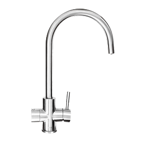 Смеситель из нержавеющей стали с функцией подачи фильтрованной воды в классическом дизайне. Экономит пространство на кухне за счет совмещенной системы подачи водопроводной и очищенной воды и подойдет тем, не готов сверлить дополнительное место под кран с отфильтрованной водой.