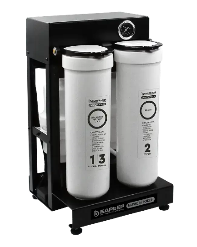 - БАРЬЕР БАРИСТА 3 ступеньКорпус с мембраной обратного осмоса для глубокой очистки водыПредназначен для глубокой очистки воды от ионов тяжелых металлов, органических соединений и минеральных солей