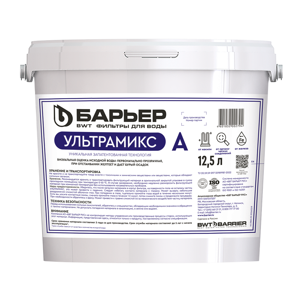 Фильтрующий материал БАРЬЕР УЛЬТРАМИКС А предназначен для удаления из воды избыточной жесткости снижения содержания аммония*, марганца*, органических соединений (перманганатная окисляемость /ПО)*. Финишная очистка фильтром БигБлю избавляет от неприятного запаха и привкуса воду, убирает мутность.