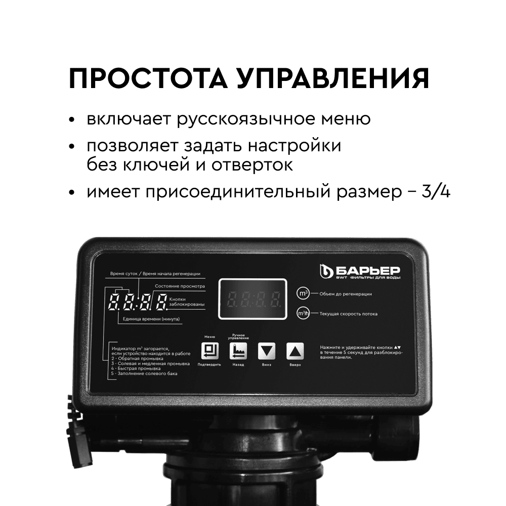 Автоматический блок управления БАРЬЕР ПРО100 РВ3/4 регулирует процессы промывки фильтров в автоматическом...