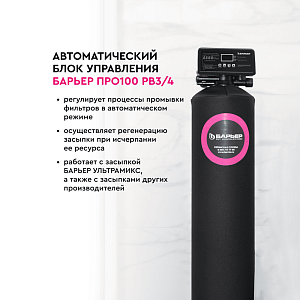 Автоматический блок управления БАРЬЕР ПРО100 РВ3/4 регулирует процессы промывки фильтров в автоматическом режиме. Обеспечивает своевременную регенерацию засыпки БАРЬЕР УЛЬТРАМИКС, а также позволяет использовать засыпки других брендов.