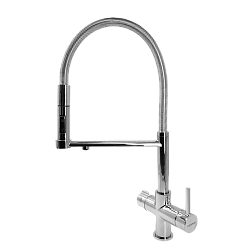 Уникальный смеситель из нержавеющей стали экономит пространство на кухне за счет возможности подачи водопроводной, очищенной и минерализованной воды в одном кране