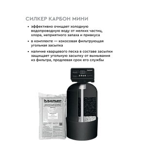 Система очистки воды СИЛКЕР Карбон мини похожа на полноразмерные фильтры для очистки воды: внутри колонны располагается дренажно-распределительная система с фильтрующим материалом, регулируется работа с помощью надежного автоматического блока управления. Фильтр работает с загрузкой на основе индийского кокосового активированного угля. В комплекте с СИЛКЕР Карбон мини поставляется засыпка в мешке на 10 литров, сменную засыпку можно приобрести в мешках по 25 литров.