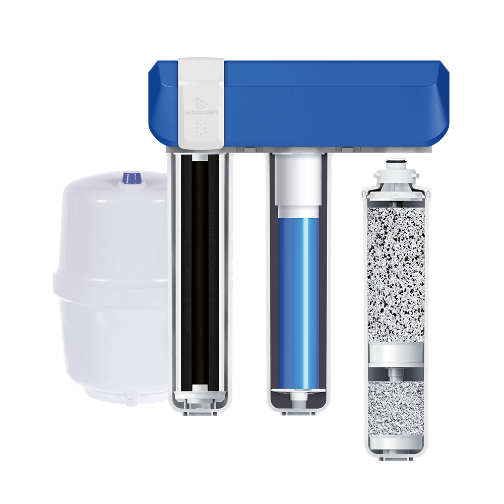 БАРЬЕР Компакт ОСМО 75 М — система обратного осмоса для тех, кто хочет получить от фильтрации максимум. Больше не нужно выбирать: чистая или полезная? БАРЬЕР Компакт ОСМО 75 М — это первый трёхступенчатый обратный осмос, который позволяет использовать сразу 2 типа воды под ваши нужды: обратноосмотическую — для бытовой техники и минерализованную — для питья. Эффективность работы фильтра не уступает многоступенчатым обратноосмотическим системам. Продуманная конструкция позволяет менять картриджи без специальных инструментов, навыков или ключей за 30 секунд, а компактные размеры фильтра сэкономят место на кухне. В комплектацию системы не входит кран для чистой воды, что позволяет не переплачивать за него тем, кто уже приобрел четырехходовой кран самостоятельно. Показатели после фильтрации: общая минерализация для обратноосмотической воды — до 50 ppm, общая минерализация после обогащения минералами — более 80 ppm, pH в диапазоне 6-9. Показатель минерализации может варьироваться в зависимости от условий эксплуатации и водопотребления.