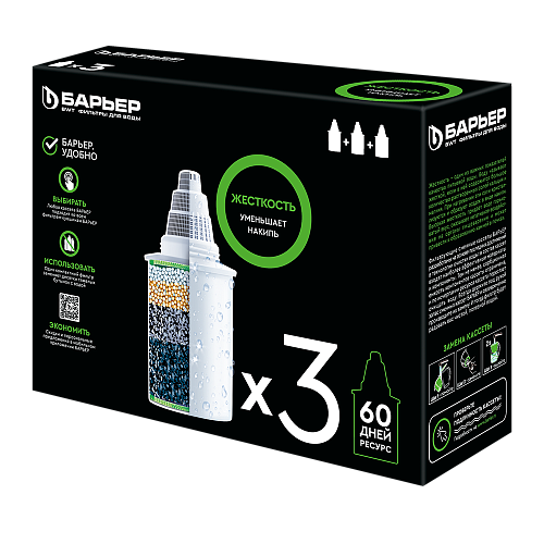 Комплект из 3 сменных кассет для фильтра БАРЬЕР Стандарт. Очищает воду от хлора и его продуктов, тяжелых металлов и других вредных примесей. Удаляет посторонние привкусы и запахи. Ресурс каждой кассеты — 350 литров.