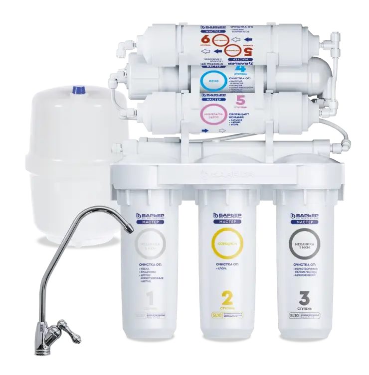 Шестиступенчатый фильтр обратного осмоса в корпусе классического исполнения с картриджами стандарта Slim Line 10. Не только очищает воду, но и насыщает её полезными ионами кальция, фтора и магния до физиологической нормы. Вода проходит несколько этапов очистки, включая обратноосмотическую мембрану. Тонкопленочный полиамидный композит, из которого изготовлена мембрана, очищает воду на молекулярном уровне до 100%, задерживая всевозможные примеси, включая бактерии и вирусы. Вода после фильтра обратного осмоса не уступает по качеству бутилированной.